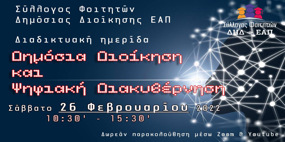 Η πρώτη επιστημονική ημερίδα του Συλλόγου Φοιτητών Δημόσιας Διοίκησης του Ελληνικού Ανοικτού Πανεπιστημίου πραγματοποιήθηκε διαδικτυακά το Σάββατο 26 Φεβρουαρίου 2022 με θέμα «Δημόσια Διοίκηση & Ψηφιακή Διακυβέρνηση». Μέσα από μία πρωτόγνωρη, αλλά άκρως δημιουργική διαδικασία για τα δεδομένα του μόλις ενός έτους Συλλόγου μας, την πρόσκλησή μας αποδέχτηκαν εκλεκτοί ομιλητές, οι οποίοι μοιράστηκαν μαζί μας τις γνώσεις, τις απόψεις, την κατάρτισή τους, αλλά και τους προβληματισμούς τους. Αναλυτικότερα, την ημερίδα τίμησαν με την παρουσία τους και απηύθυναν χαιρετισμό ο Πρόεδρος της Διοικούσας Επιτροπής του ΕΑΠ, κ. Ζώρας Οδυσσέας-Ιωάννης, ο Αντιπρόεδρος Ακαδημαϊκών, Διοικητικών Υποθέσεων και Φοιτητικής Μέριμνας κ. Ευσταθόπουλος Ευστάθιος, ο Κοσμήτορας της Σχολής Κοινωνικών Επιστημών του ΕΑΠ, κ. Μιχιώτης Αθανάσιος και ο Πρόεδρος της Ακαδημαϊκής Επιτροπής Εποπτείας του προγράμματος της Δημόσιας Διοίκησης, κ. Ψυχάρης Γιάννης. Από την πλευρά του Συλλόγου χαιρετισμό απηύθυνε ο κ. Μαρκάκης Βασίλειος –Αντιπρόεδρος του Συλλόγου.